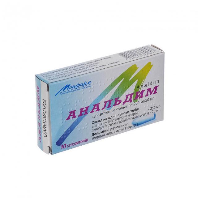 Анальдим производится ведущим фармацевтическим украинским предприятием ОАО «Монфарм». Препарат выпускается в виде ректальных суппозиториев белого или кремового оттенка торпедообразной формы с гладкой поверхностью. 1 свеча содержит 250 или 100 мг анальгина и 20 или 10 мг димедрола соответственно. В качестве основы при изготовлении Анальдима используются твердый жир и эмульгатор № 1.