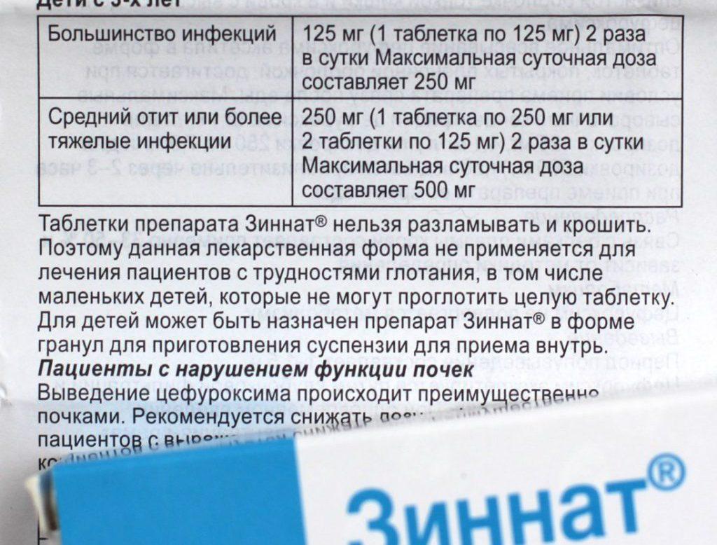 Для оптимального всасывания суспензию Зиннат® следует принимать во время еды. Отсутствуют данные клинических исследований относительно применения препарата Зиннат® у детей младше 3 месяцев. Если предпочтительно назначение фиксированной дозы, то при большинстве инфекций рекомендуется применять по 125 мг 2 раза/сут.