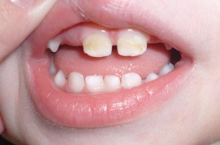 - Травмы зубов и кариес. На начальной стадии кариес выглядит в виде небольших белых пятен, которые со временем темнеют и становятся глубже. При падениях и случайных ударах у ребенка могут быть травмированы передние зубы. Впоследствии нарушается кровоснабжение костной ткани, и зубы темнеют.