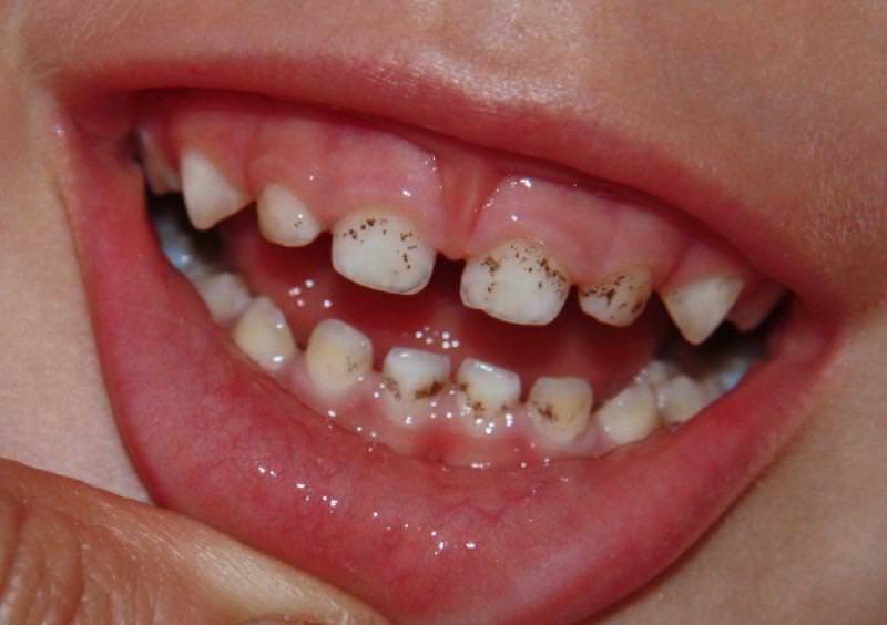 Возникновение коричневой, черной и серой пигментации снаружи и внутри молочных зубов зачастую связано с аномалиями внутриутробного развития. Закладка костной системы плода проходит в первые 3 месяца беременности, поэтому молодой маме важно полноценно питаться. На патологическое формирование костной и зубной ткани влияют такие факторы: