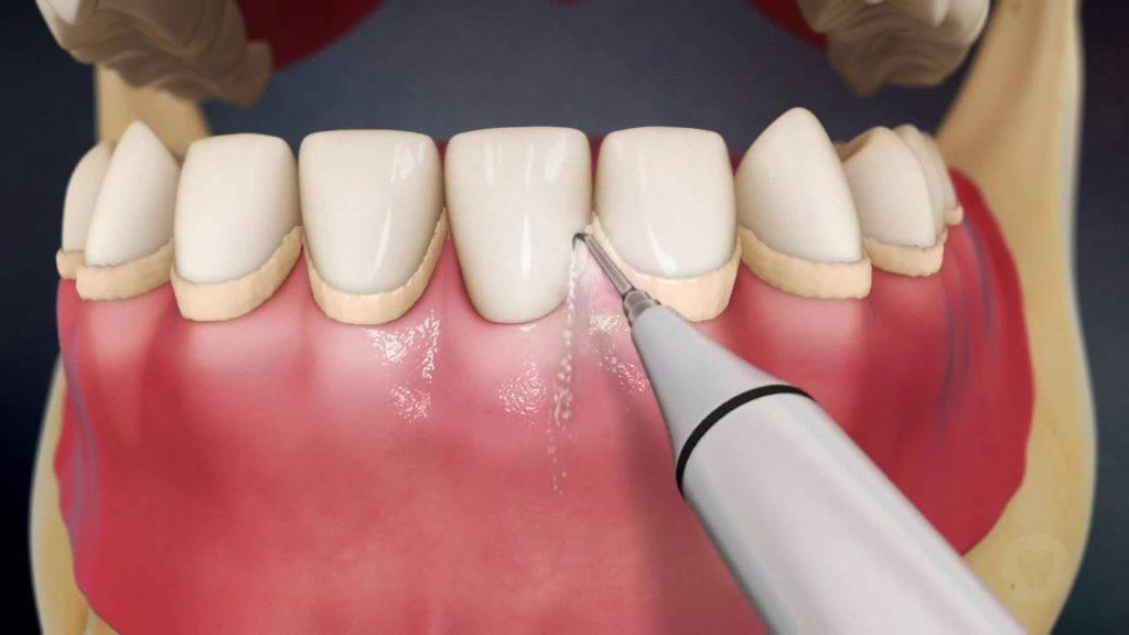 - Пескоструйная. Струя воды с мелкодисперсными абразивными элементами поочередно подается к каждому зубу. Чистящий состав бережно удаляет налет и камень, возвращает блеск эмали.