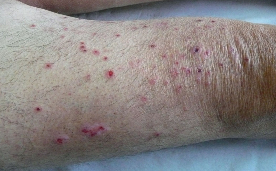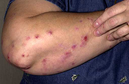 Развитие пруриго Гебры характерно для детского возраста при гиповитаминозах и дистрофических расстройствах. Болезнь проявляется в виде крапивницы на первом году жизни, позднее – в виде крупных узелков на сгибах ног и рук, сопровождающихся сильным зудом. На начальной стадии проявления этого зудящего дерматоза симптомы в виде узелков однородны с окраской кожи. После расчесывания кожные покровы уплотняются, начинают шелушиться и окрашиваются в серо-коричневые оттенки. Нередко пруриго Гебры осложняется вторичной инфекцией. В этом случае увеличиваются лимфоузлы, проявляются нервные расстройства.
