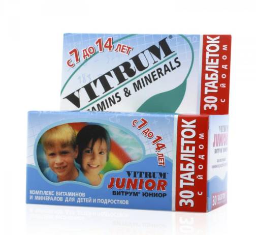 - Витрум Юниор подойдет для 7–14-летних детей, которые постоянно занимаются умственным трудом. Для препарата характерно повышенное содержание йода, активизирующего работу мозга, витамина А, отвечающего за сохранение зрения и витамина С, оберегающего от частых респераторных заболеваний.