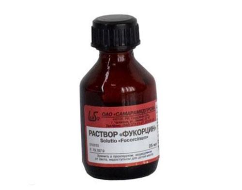 Использование Фукорцина обосновано в тех случаях, когда вокруг пораженной области начинают образовываться гнойнички и язвочки бактериального происхождения. В этих случаях обрабатывают раствором периметр очага поражения, предварительно смазанный лекарственной мазью или обработанный гелем/спреем.