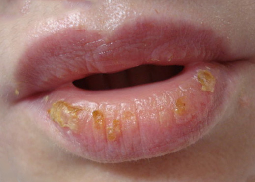 Представляет собой симптом нейродермита или атопического дерматита. Большое значение в развитии заболевания играет наследственный фактор, создающий условия для аллергической реакции. Раздражителями в данном случае могут стать пищевые продукты, косметические и лекарственные средства. При заболевании наблюдаются покраснение, зуд, шелушение, трещины в уголках губ.