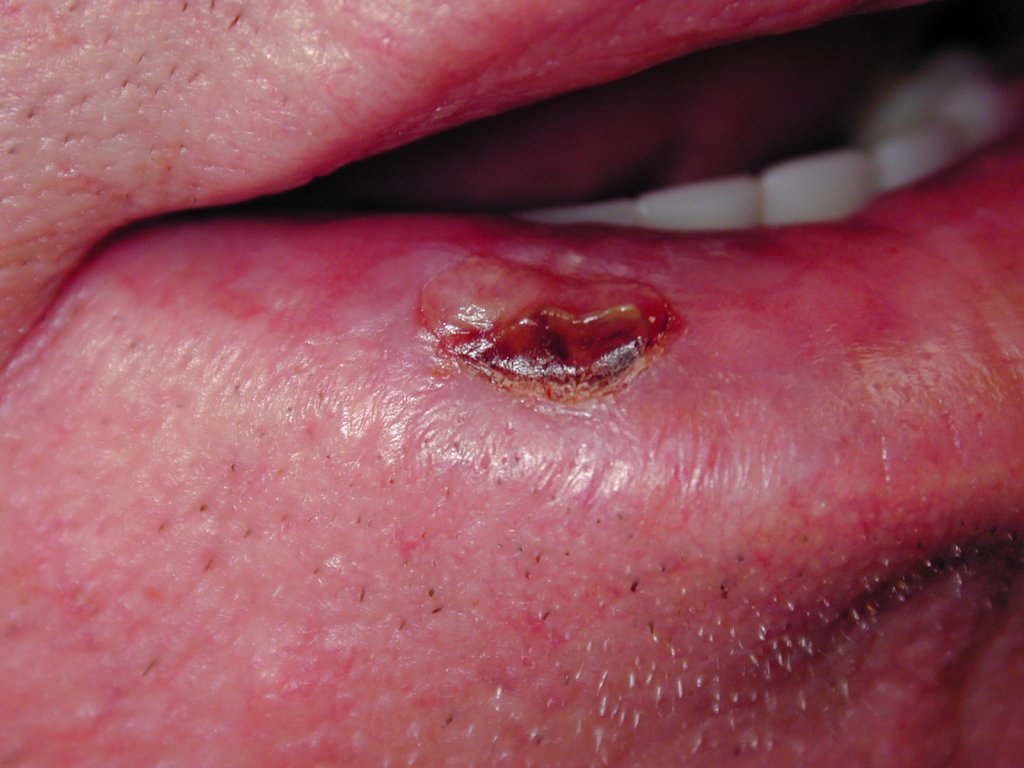 Чаще всего встречается у пожилых мужчин после 60 лет. Основной причиной появления считаются авитаминоз А, травматизация или осложнения на одну из болезней пищеварительной системы. Но, главным предрасполагающим фактором к появлению данной формы считается снижение регенераторных свойств слизистой оболочки, характерных для процесса старения. Первые признаки абразивного хейлита Манготти – появление на нижней губе 1-2 эрозий округлой формы и покрытых тонкой корочкой. Субъективные ощущения отсутствуют и даже при надавливании нет признаков боли или уплотнения. Течение чаще всего хроническое. Самостоятельное заживление эрозий практически не наблюдается. Наоборот — большой риск малигнизации, который сопровождается бородавчатыми разрастаниями. Для постановки диагноза проводятся гистологическое и цитологическое исследования, которые исключат эрозивную форму красного плоского лишая, герпес или лейкоплакию.