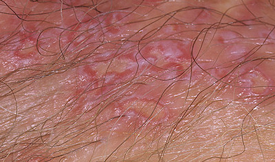 Кожа полового члена покрывается сыпью в виде чешуйчатых пятен красного или белого цвета. Бывают и экземоподобные высыпания в виде мелких пузырьков. Такая симптоматика связана с развитием аллергии на деятельность кандид и очень часто сопровождается зудом и жжением. Головка и крайняя плоть краснеет и отекает, появляется беловатый налет.