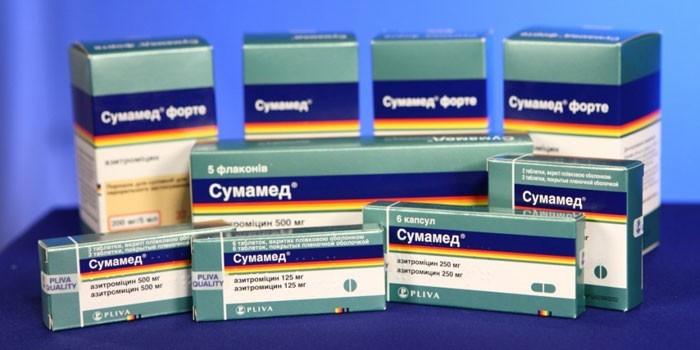 | Сумамед | Таблетки, капсулы, порошок для разведения | Дигидрат азитромицина | Чувствительность к компонентам препарата, тяжелые патологии печени, одновременный прием с эрготамином и дигидроэрготамином, недостаток сахаразы и изомальтазы, непереносимость фруктозы, глюкозо-галактозная мальабсорбция | ≥ полугода – для жидкой формы, ≥ 3 – для таблеток 125 мг, ≥ 12 – для капсул и таблеток 500 мг |