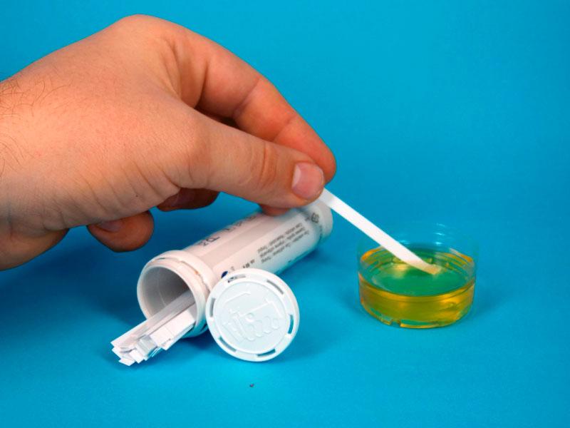 - Экспресс-метод с использованием тест-полосок. Для осуществления этой методики требуются специальные полоски с индикатором, которые опускают в мочу. Преимуществом этого метода является простота выполнения и высокая скорость получения результата, а недостатком — невысокая точность. Данный способ применяется для самостоятельного контроля наличия кетонов в моче и в ситуациях, когда нужно быстро обследовать большое количество больных, как при профилактических осмотрах;