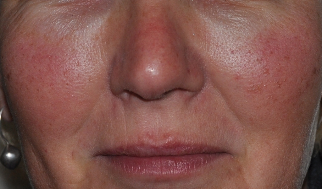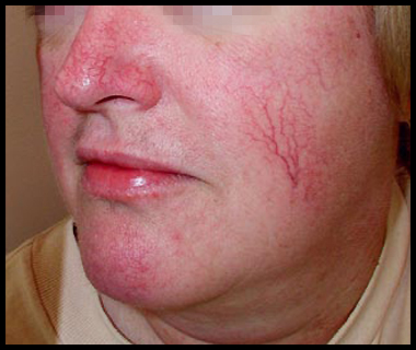 - Развитие розацеа на лице, для которой характерны сильные покраснения в области носогубного треугольника.