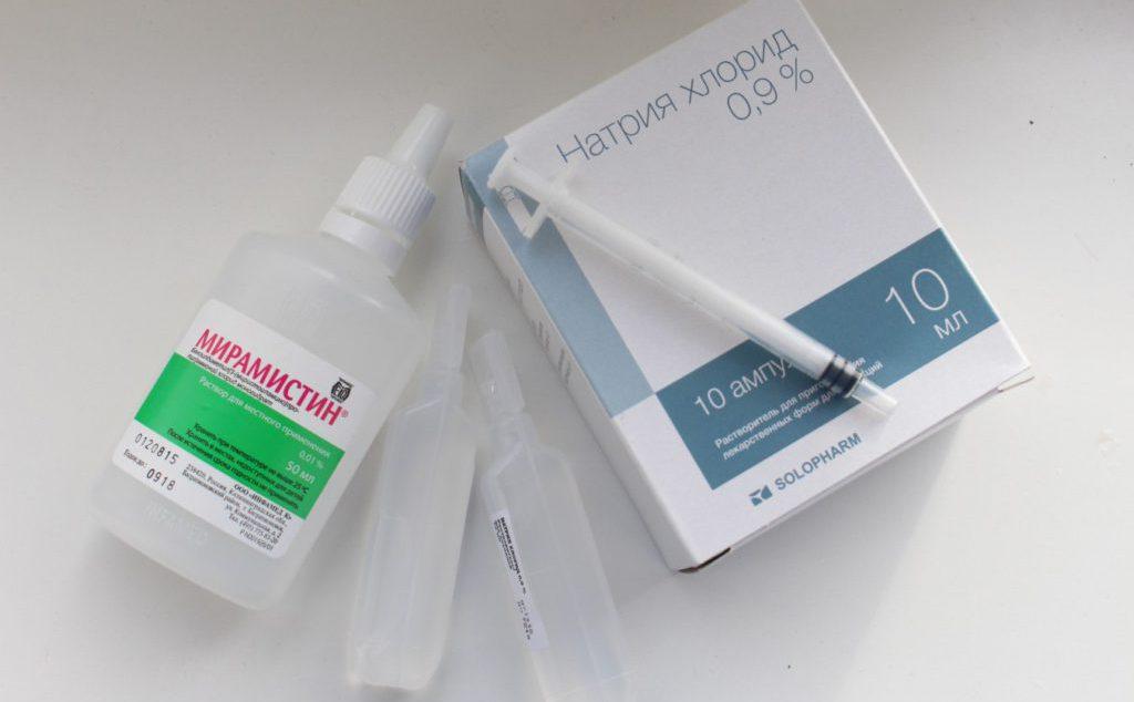 - При насморке нужно закапывать лекарство в нос по 1 капле дважды в сутки, предварительно промыв носовые пазухи солевым раствором. Если нос сильно заложен, его можно прочистить Мирамистином. Для этого нужно развести 2-4 капли лекарства чистой водой.