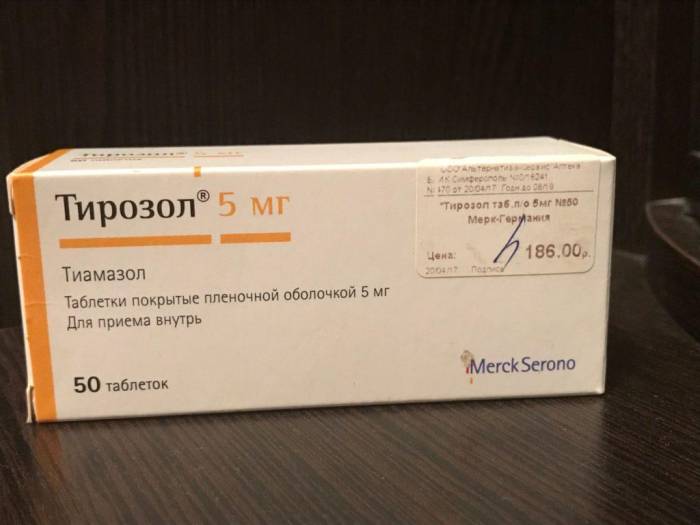 - Медикаментозная терапия. Она направлена на выведение из организма избытка вещества. Осуществляется путем приема тиреостатических препаратов (Тирозол, Мерказолил, Пропицил и др.). Для положительного эффекта принимать лекарства нужно длительное время, иногда до 2 лет.