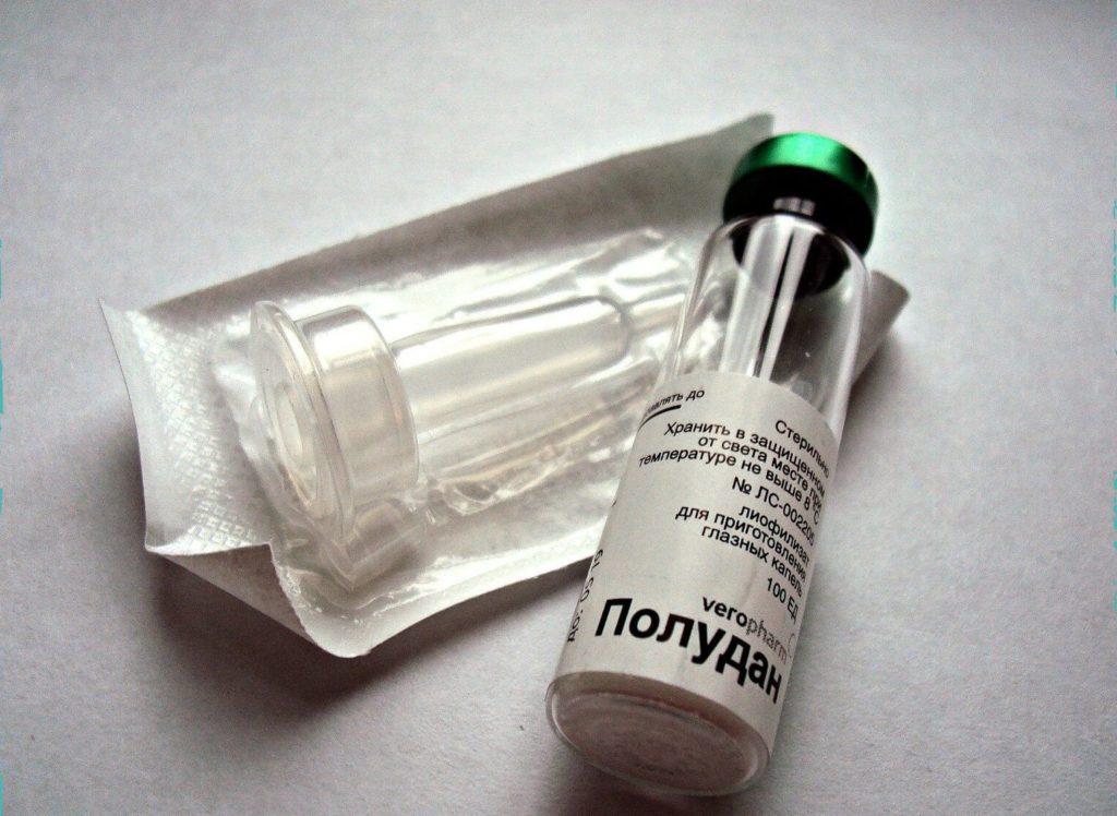 - Полудан. Этот антивирусный препарат стимулирует выработку белка-интерферона, отвечающего за невосприимчивость организма к возбудителю болезни; поэтому наибольшую эффективность средство показывает в борьбе с глазными воспалениями, сопутствующими гриппу, ОРВИ и прочим похожим инфекциям. Продается в виде сухого порошка для приготовления раствора, что создает определенные неудобства в применении.