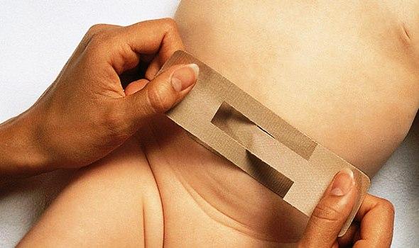 Помимо лечебной физкультуры и массажа, лечить пупочную грыжу можно с помощью специальных лейкопластырей, обладающих специфическими характеристиками и формой. Эти изделия категорически запрещено использовать на незажившем пупочке. Образуемая в результате наклеивания пластыря складка кожи будет препятствовать заживанию пупка, провоцируя развитие воспалительного процесса в нем.