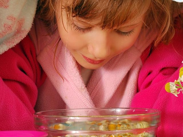 Для проведения ингаляции понадобится один стакан получившегося отвара. Его выливают в широкую и плоскую миску и усаживают над ней ребенка. Голову малыша накрывают полотенцем, и в таком положении он должен просидеть от 5 до 8 минут. При этом ребенок должен делать глубокий и затяжной вдох ртом. Ингаляции теплым и горячим воздухом показаны детям старше одного года.