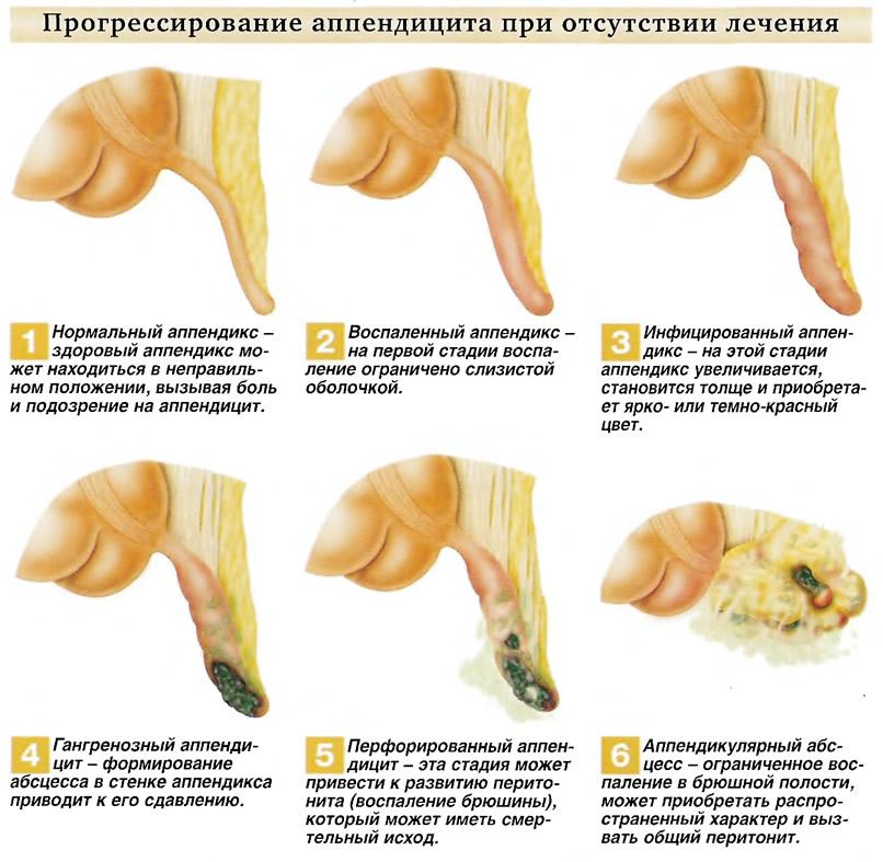 В переполненном аппендиксе происходит быстрый рост бактерий, которые провоцируют его увеличение и напряжение стенок. Это приводит к появлению отека, препятствующего нормальному кровоснабжению органа. Венозный застой вызывает омертвление отростка. При некрозе происходит повреждение стенки аппендикса, и все его содержимого попадает в брюшную полость. Такое состояние называется перитонит.