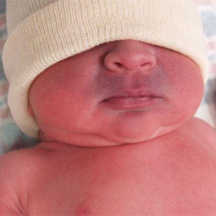 - Недостаточность митрального клапана. У новорожденного появляются цианоз губ и щек, одышка, дрожание грудины, на шее набухают вены.