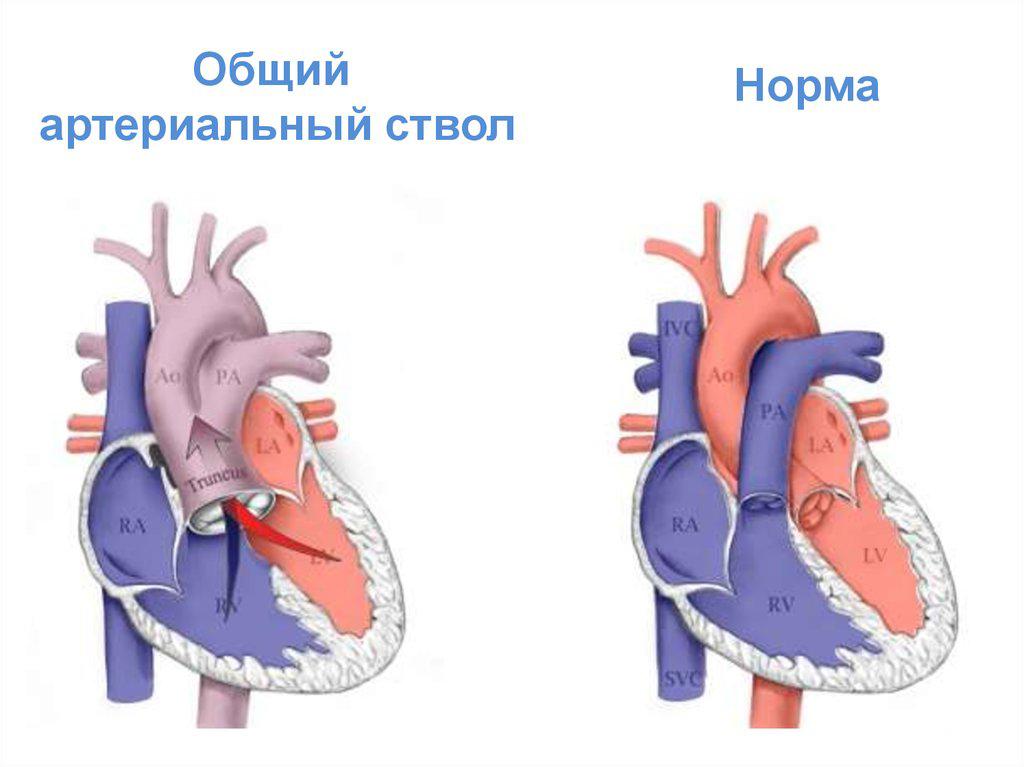 - Общий артериальный ствол. Патология, при которой от сердца отходит один сосуд, а не два, вследствие чего артериальная и венозная кровь смешиваются (без операции выживает 25% детей). Наблюдаются задержка в развитии, одышка, сердечные шумы.
