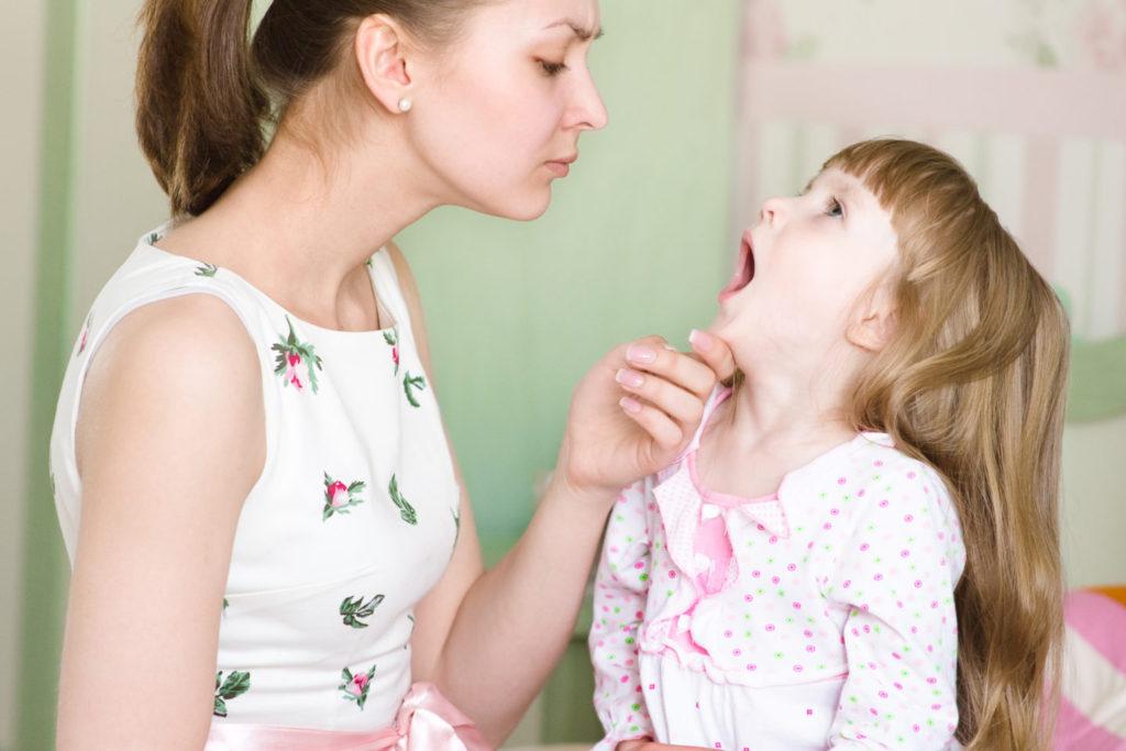 Боль в горле часто сопровождается затруднением глотания, отсутствуют насморк и кашель, всегда увеличенные и болезненные шейные лимфатические узлы, наличие налета на миндалинах, иногда развитие болезненного тризма мышц челюсти, когда ребенку сложно открыть рот.