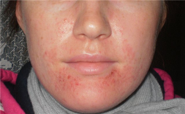 - Стадия папуло-пустулезных проявлений. Помимо покраснений появляются скопления прыщей и гнойничков. Через несколько недель они проходят, рубцы обычно еле заметные. Возможен отек кожных покровов в районе лба и между бровями. Длительное пребывание под воздействием солнечных лучей вызывает появление бугорков (солнечных комедонов). Жжение и покалывание на этой стадии убывает. Гнойнички распространяются на всей коже лица, волосистой части головы, груди и иногда спине. Пораженные кожные покровы головы сильно зудят.