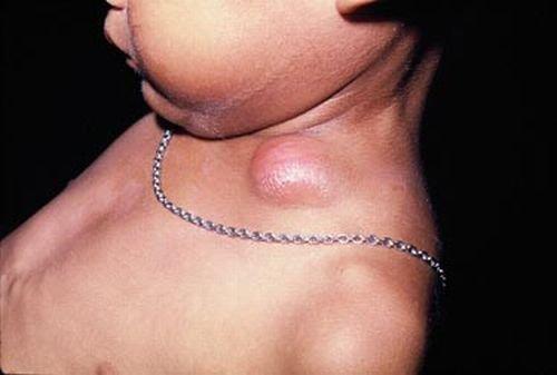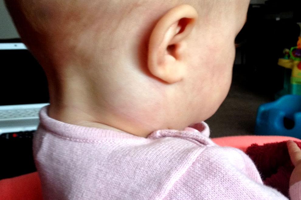 С развитием заболевания лимфоузел постепенно начинает терять свои контуры, увеличиваясь в размерах, в районе воспаления наблюдается покраснение кожных покровов, появляются болевые ощущения. У ребенка может начаться лихорадка. Внешне пораженный участок напоминает фурункул. Пример шейного лимфаденита на последней стадии развития представлен на фото.