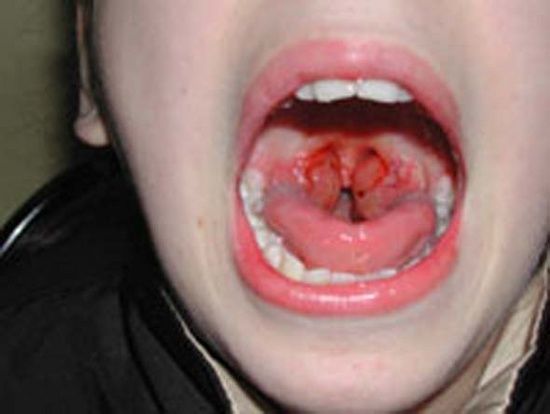 Первичным проявлением скарлатины считается воспаление горла. Все остальные признаки сильно напоминают фарингит, у ребенка появляются головные боли, сыпь на коже, чувство распухания горла и высокая температура тела. Нередко подобные формы данного заболевания осложняются почечными воспалениями, повреждением клапанов сердца и ревматоидной лихорадкой. Заметна скарлатина становится только после проявления высыпаний и линий Пастьи. В последнем случае речь идет о продолговатых красных линиях, возникающих в местах частых изгибов и складок. В особенно тяжелых случаях скарлатина у детей схожа с обычной формой, но с дополнительным воспалением лимфоузлов, весь язык покрывается ярко-красными высыпаниями, а температура поднимается до уровня сорока градусов Цельсия.