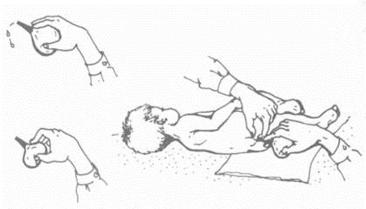 - Перед процедурой нужно попросить ребенка испражниться. После этого область промежности тщательно моется и обсушивается.