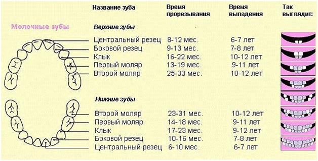 Два резца внизу по центру – 5-6- 10 мес. , два резца вверху по центру– 8-12 мес. , боковые резцы – до 12-ти мес. , моляры первые –12-18 мес, клыки — полтора-два года, моляры вторые — два -два с половиной года.