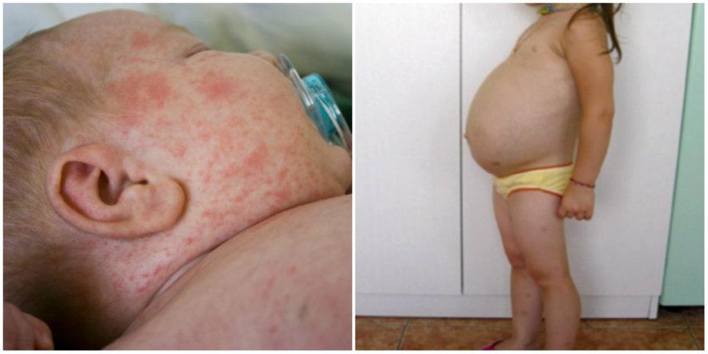 У грудничков заболевание никак не проявляется, симптомы заметны к 1,5 – 2 годам. Целиакия у детей характеризуется особенными внешними признаками – это неестественно большой живот и отсутствие ягодиц из-за атрофии мышц. Начальную и запущенную стадии болезни родители могут распознать по фото.