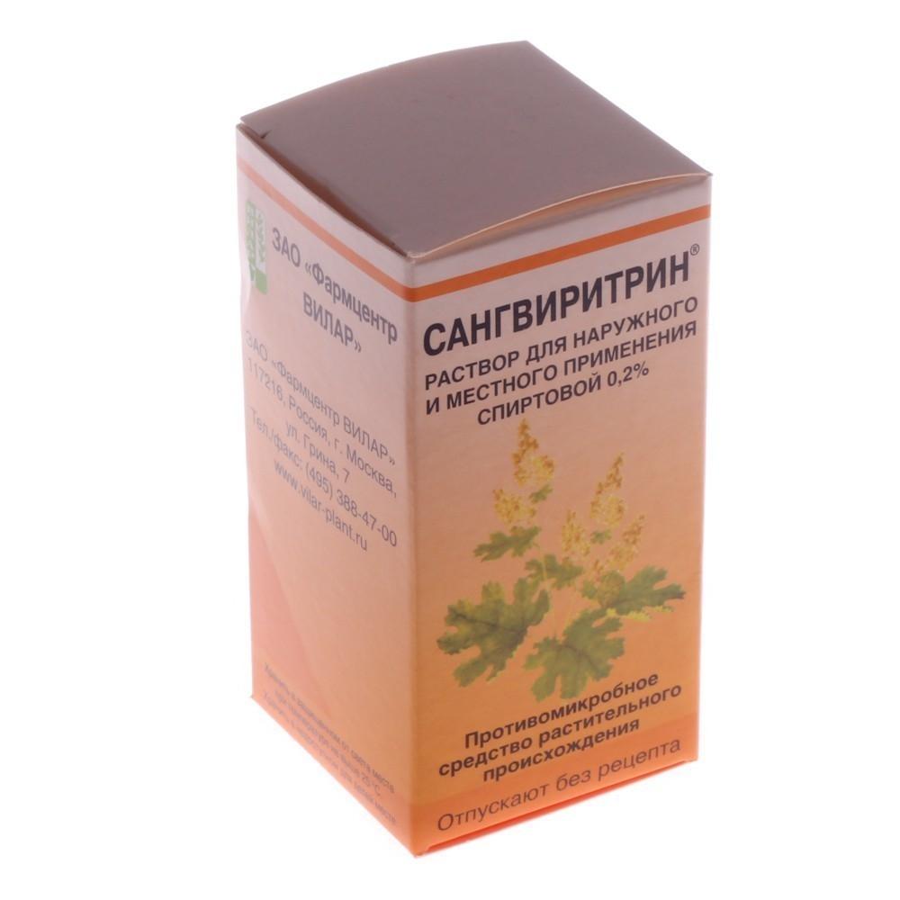 Раствор Сангвиритрина применяется для обработки полости рта при стоматитах. Антивирусных свойств не имеет, но обладает антибактериальными и противогрибковыми свойствами. Используется при ветрянке для устранения заражения поврежденных везикул, облегчения зуда, уменьшения болей в горле, снятия воспаления с языка и миндалин.