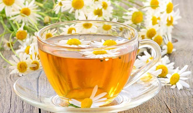 - Ромашка аптечная. 1 столовую ложку сухих цветков заливают кипятком (понадобится 1 стакан жидкости) и настаивают в течение получаса. Перед употреблением средство охлаждают и процеживают. Принимают ромашку до либо после еды – трижды в день по 1/3 стакана.